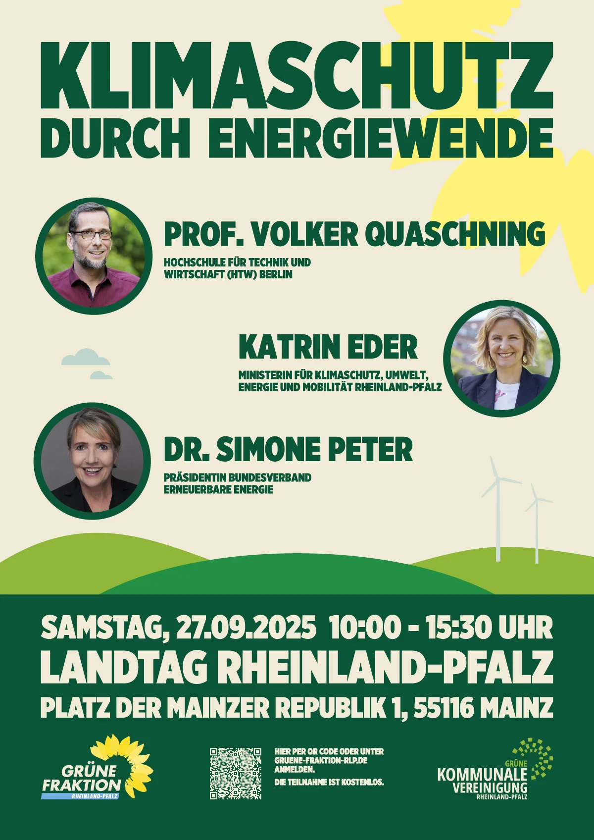 Nach einer Begrüßung durch Pia Schellhammer, Fraktionsvorsitzende der GRÜNEN Landtagsfraktion und Co-Vorsitzende der GKomV, eröffnet Klimaschutzministerin Katrin Eder die Veranstaltung mit einer politischen Keynote. Prof. Dr. Volker Quaschning (Hochschule für Technik und Wirtschaft Berlin), Experte für Regenerative Energiesysteme und bundesweit bekannt für seine prägnante Wissenschaftskommunikation zur Energiewende, betont in seiner Keynote die Dringlichkeit eines deutlich schnelleren Ausbaus der Erneuerbaren Energien. An der anschließenden Podiumsdiskussion beteiligt sich unter anderem die Präsidentin des Bundesverbands Erneuerbare Energien, Dr. Simone Peter. Im Mittelpunkt der Diskussion steht die Frage, wie Rheinland-Pfalz bis 2040 klimaneutral werden kann. Zum Abschluss lädt ein „Markt der Möglichkeiten“ dazu ein, die Geschichten des Gelingens der Energiewende in Rheinland-Pfalz kennenzulernen. Durch den Tag führt der klimapolitische Sprecher der GRÜNEN Landtagsfraktion, Fabian Ehmann.